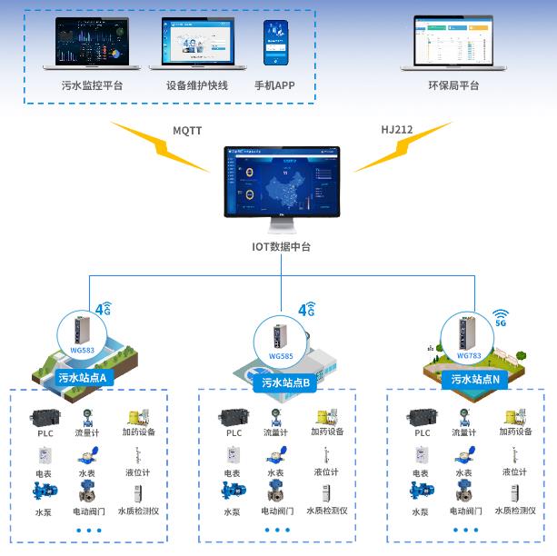 基于日常巡检与远程维护的需求,物通博联提供基于工业智能网关的解决方案。通过将污水处理PLC、DLT智能电表、智能摄像头等设备接入到网关,网关能够实时采集污水处理工艺参数、能耗以及实时视频等数据,并通过4G网络和MQTT协议对接到集团运维管理平台中,从而实现远程监控、远程控制、远程抓拍、远程维护等功能,从而实现智慧运维管理,促进降本增效目标的实现。