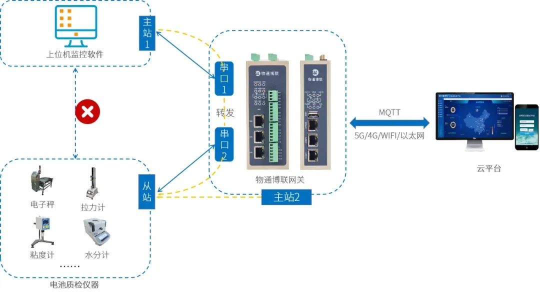 在此背景下,物通博联以工业数采网关为核心,推出电池质检参数可视化管理系统方案。网关通过连接各类电池质检仪器,包括电子称、拉力计、粘度计、水分计等,后端对接本地上位机。通过网关实时采集质检仪器产生的电池重量、隔膜横向和纵向拉伸强度、电解液粘度、水分等关键参数数据,并将数据上传至本地上位机,上位机对数据进行处理、存储,形成可视化数据报表,实现对电池质检参数的全面管理。