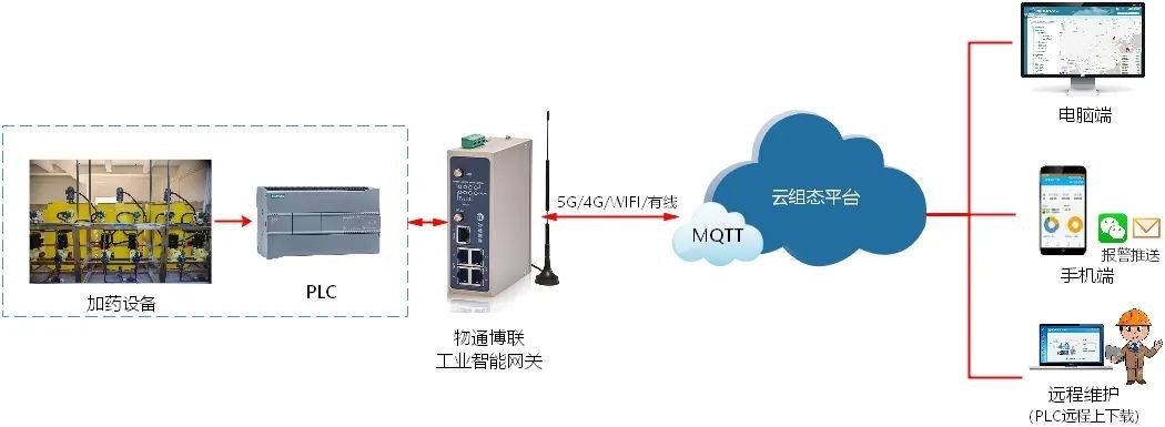 对此,物通博联(WideIOT)提供加药装置PLC数据采集解决方案。通过接入控制器PLC,工业智能网关能够实时采集水质、流量、液位、加药量等数据,并通过5G/4G/WIFI/以太网等方式对接到上位机或云平台中,从而实现远程监控、异常告警、远程控制与统计分析等功能,有效推进节能降耗目标的实现。