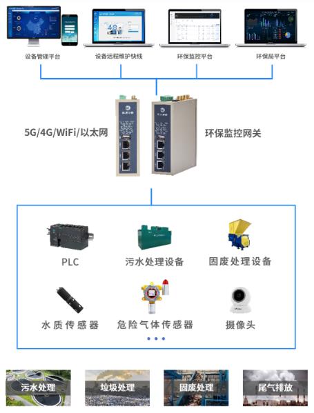 现场各个监测站点部署数采网关,接入控制器PLC、水质监测仪、废气传感器、流量计等设备,能够实时采集设备运行状态与排放参数并实现4G上网,随后对接到可视化管理平台实现远程监控、异常告警、在线控制、报表生成与数据分析等功能,从而提升生产环保管理水平,指导工厂做出科学合理决策。