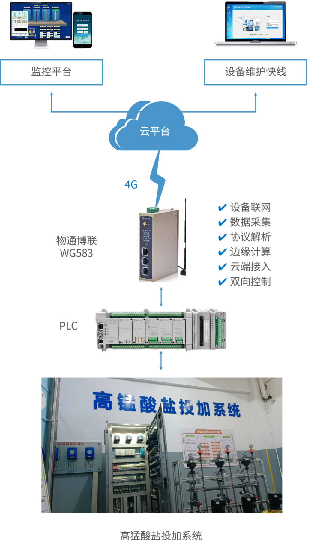 现场各加药室较分散,依赖人工操作不仅劳动强度大,而且容易出现人为错误,如药剂投加过量或不足,影响处理效果。 02 故障响应能力差 由于缺乏有效的故障预警机制,导致故障发现滞后,面对突发故障的响应能力较差,难以形成高效可靠的运维机制。 03 数据分析应用少 环药剂的投加量需根据水质实时监测数据进行精确调整,但由于缺乏实时、可靠的数据支持,设备运行策略和处理效率迟迟得不到优化。 解决方案 物通博联根据客户需求,为客户搭建了一套具备自动化、智能化和高效化的高锰酸盐投加系统,该系统是通过物通博联·工业智能网关WG583采集控制器终端AB PLC,并通过4G网络将数据对接到物通博联·IOT云平台中,进行组态绘制呈现组态大屏,可以实现24小时不间断检测泵站运行的实时数据,动态显示高锰酸盐储液罐液位以及各个水池流量,并在出现异常时自动告警,同时也能灵活设置投加溶度以及投加值,实现料水智能自动配比、物料自动化料、流体自动投加、流量精准调控、运行安全预警、故障智能报警、故障自动停机切换以及实现数据分析和预测性维护等功能。