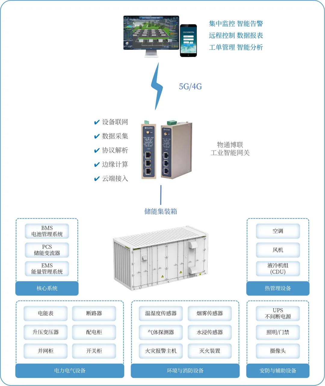 储能集装箱内部涉及BMS(电池管理系统)、PCS(储能变流器)、EMS(能量管理系统)、消防传感器、空调/液冷设备、电能表、摄像头等多种设备,协议繁杂、接口不一,数据难以集中采集与融合。