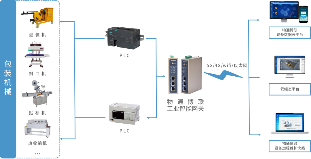 物通博联工业智能网关具有丰富的通信协议和接口,通过接入包装机械设备的控制器PLC,就能实时采集包装机械设备运行状态、温度、压力、振动等参数,通过5G、4G、WIFI、以太网等方式将数据上传到云平台,实现远程监控、组态监控、设备管理、故障报警、远程控制、远程维护、数据分析等功能,全面掌握设备的运行情况,帮助企业提升包装机械设备运维与管理水平,保障安全稳定生产,提高生产效率。当设备出现异常故障就会及时通知管理人员,工程师可以通过物通博联设备维护快线对设备进行远程故障诊断与远程维护,减少设备停机时间,有效提高设备运维效率并降低运维成本。