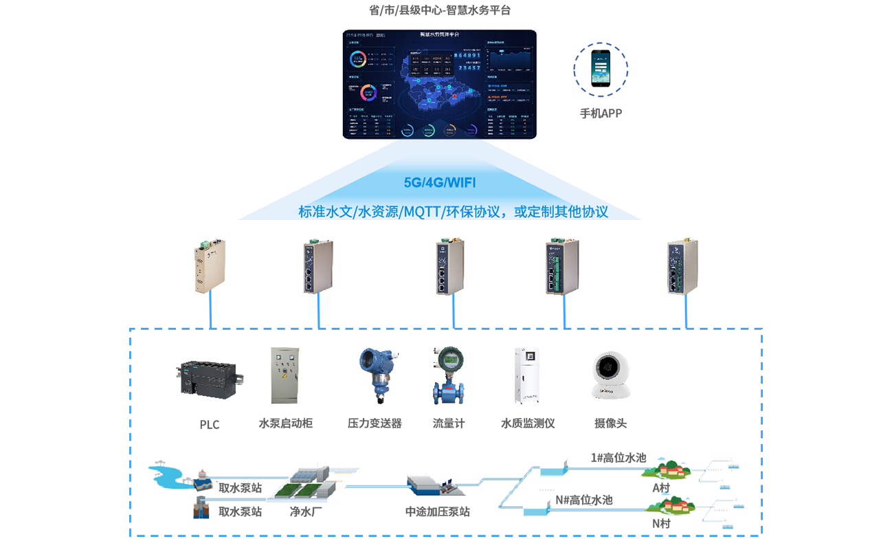 在城乡供水系统的各个关键节点(如水源地、水厂、泵站、管网等),通过物通博联的工业智能网关采集供水数据(如水量、水质、压力等)。将采集到的数据传输至城乡一体化供水信息化管理平台,平台对数据进行全面分析和处理。实时监测水质情况,根据用水量和管网压力进行优化调度,在出现紧急情况时保障应急供水。同时,平台具备用户服务管理功能,可处理用户投诉和查询,通过数据分析控制运营成本。