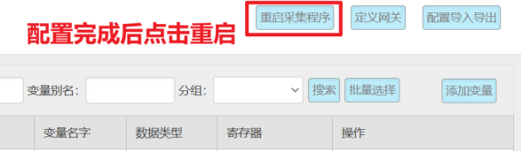 注意:数采网关LAN口地址必须与CNC IP处于同一网段且不冲突,保证网关可以Telent通CNC (IP与端口)。如果Telent不通,可查看本手册第28页“3.网关与CNC同网段配置”。 2.变量配置 变量配置主要是定义变量名(自定义内容,不可使用中文命名)、变量别名(自定义,可使用中文名字)、寄存器类型和寄存器偏移地址,并定义一些数据规则(如:倍率、小数点、单位、告警)。