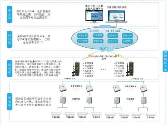 通过 RS485、RS232、以太网等多种接口,物通博联工业智能网关能连接新风设备控制器 PLC、温湿度传感器、空气质量传感器、风量风压传感器等设备,实时采集设备运行状态、环境参数等数据。随后利用 5G、4G、WIFI、以太网等通信方式,将采集的数据安全、稳定、高速传输至智慧楼宇管理系统中,为用户提供可视化界面,实现设备远程监控、数据分析、故障告警、远程控制等功能。四、实现功能