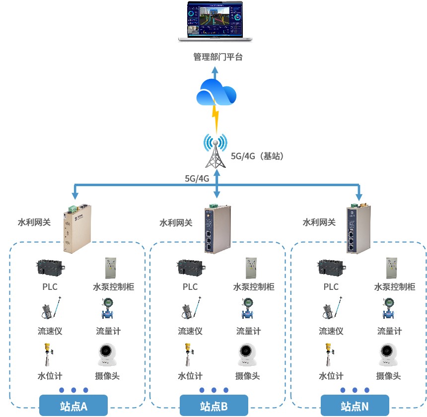 通过水利监测网关接入水泵控制柜、水位计、流量计、摄像头等设备,实现自动化数据采集并对接到指定平台中,具备断网重连和断点续传等功能确保数据通信的稳定性与完整性。