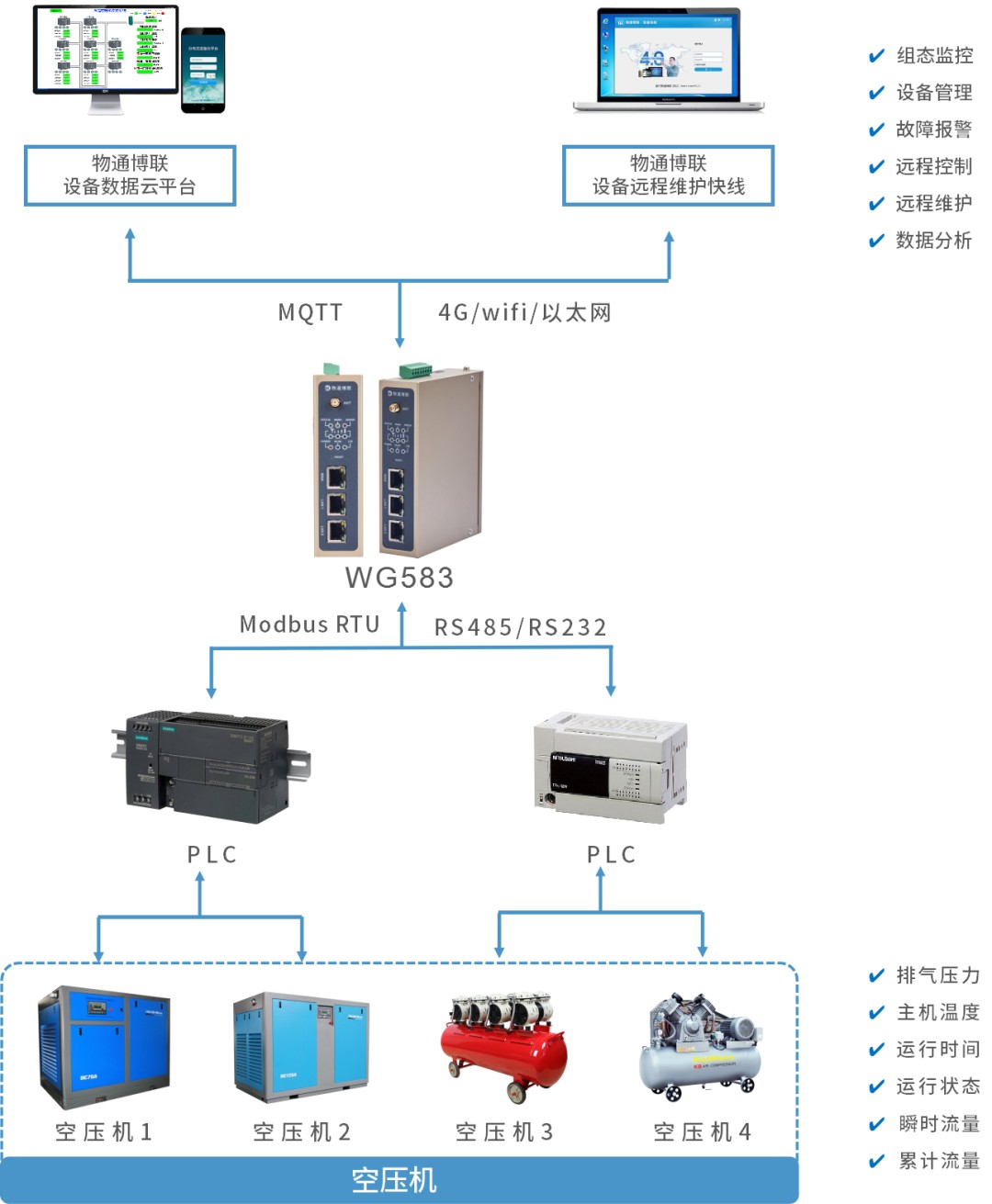 排气温度作为空压机生产运行的核心监测指标,对保障生产流程安全顺畅十分重要。然而很多空压机仅支持就地PLC控制显示,依赖人工抄表和巡检,缺乏远程监控功能,容易导致异常发现滞后,增加设备维修成本与安全风险。